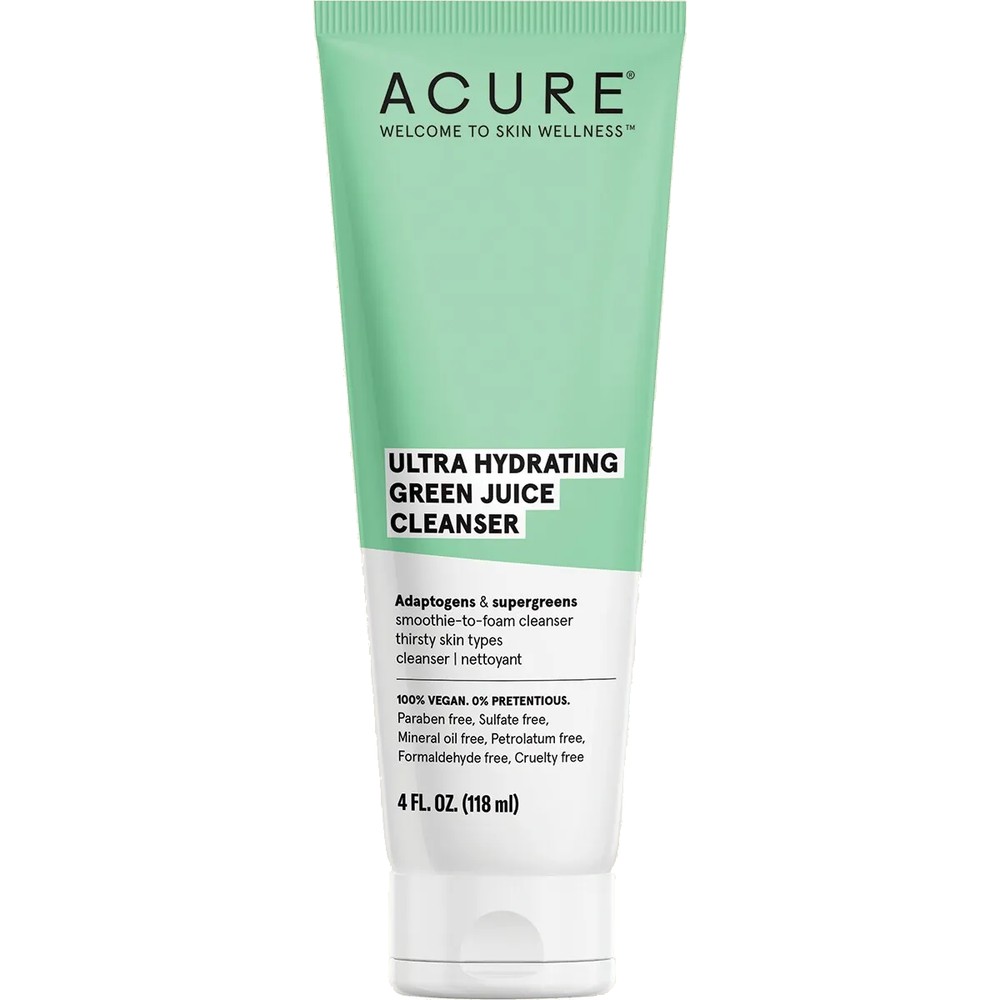 The ACURE Ultra Hydrating Green Juice Cleanser is a creamy, smoothie-to-foam cleanser that deeply cleanses while hydrating the skin.