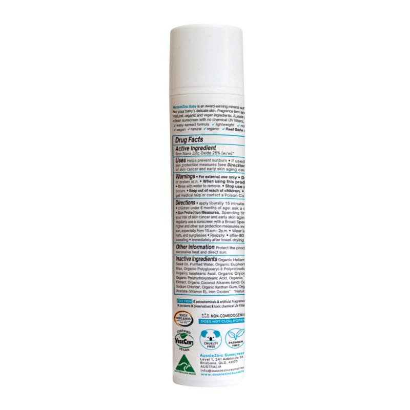 AussieZinc Baby SPF50 fragrance-free mineral sunscreen specially formulated for delicate baby skin. Non-comedogenic with natural, organic ingredients.