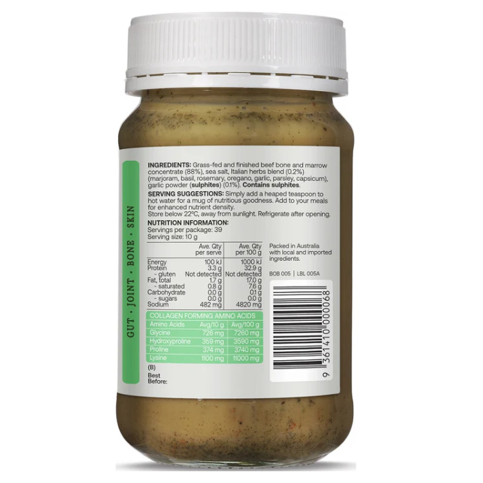 A delicious Italian herb and garlic grass-fed & finished bone broth gelatine packed with bone broth protein.