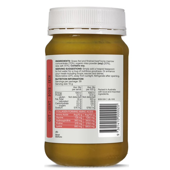 - Grass-fed and finished beef bone and marrow concentrate (70%), red organic miso powder (soy) (20%), sea salt (10%). Contains soy.