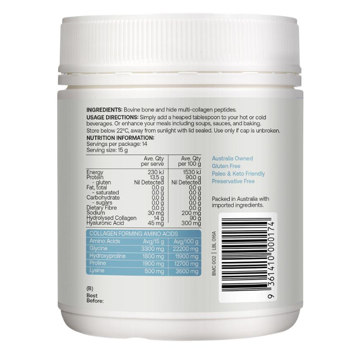 - Hydrolysed Collagen peptide powder from grass-fed, pasture-raised cows.