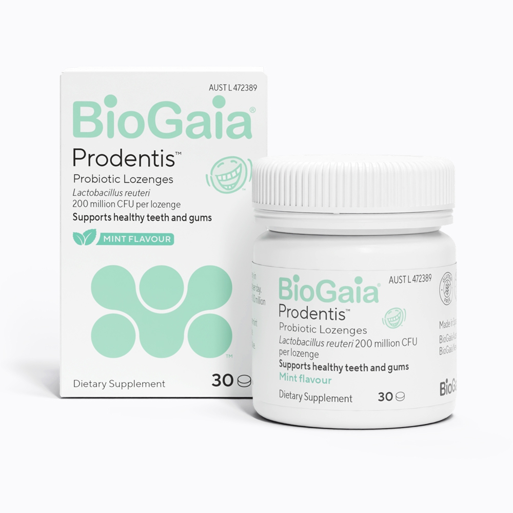 BioGaia Prodentis lozenges is a daily oral probiotic to support healthy gums and teeth. Each minty fresh lozenge features two patented bacterial strains that support a balanced oral microbiota. When combined with regular brushing and flossing, BioGaia Prodentis provides a comprehensive and easy support for oral hygiene.