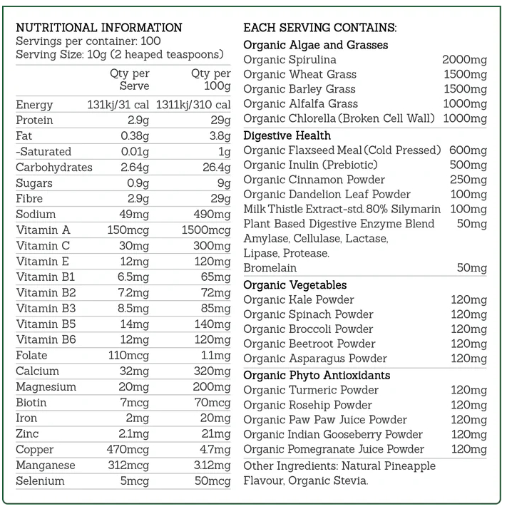 Great tasting with an anti-oxidant level equal to 10 serves of vegetables in just one serve, your body will thank you. As well as provide your daily dose of nourishment with 7g of certified organic Spirulina, Wheat Grass, Barley Grass, Chlorella and Alfalfa Grass per serve.