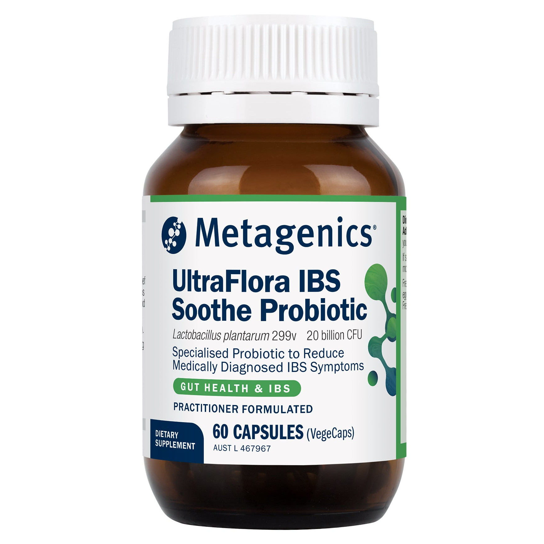 Metagenics UltraFlora IBS Soothe Probiotic contains a clinically studied probiotic strain Lactobacillus plantarum 299v shown to support medically diagnosed Irritable Bowel Syndrome (IBS). Read more
