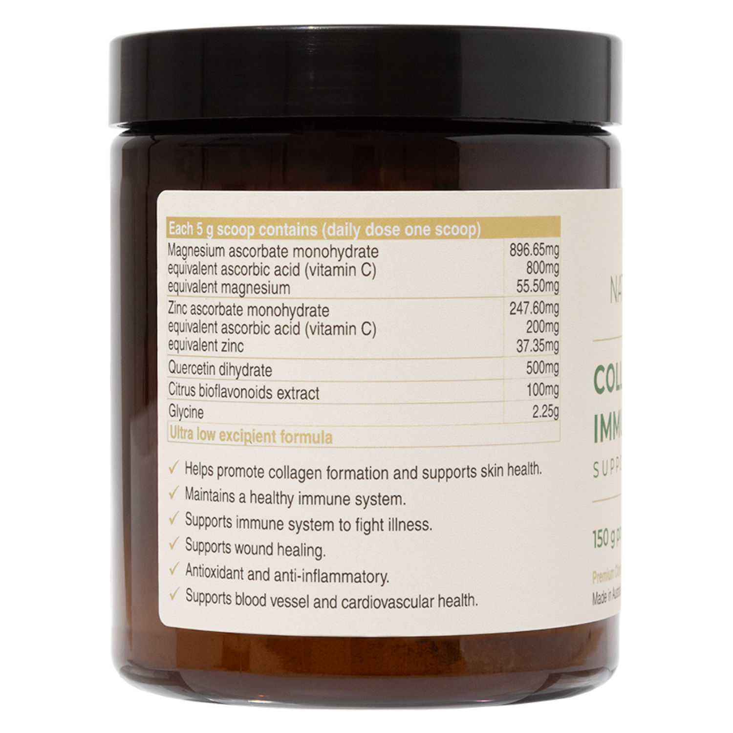NaturoElite Collagen & Immune Support is a high-potency blend of vitamin C, zinc, quercetin and citrus bioflavonoids, formulated to promote collagen production and support a healthy immune system.