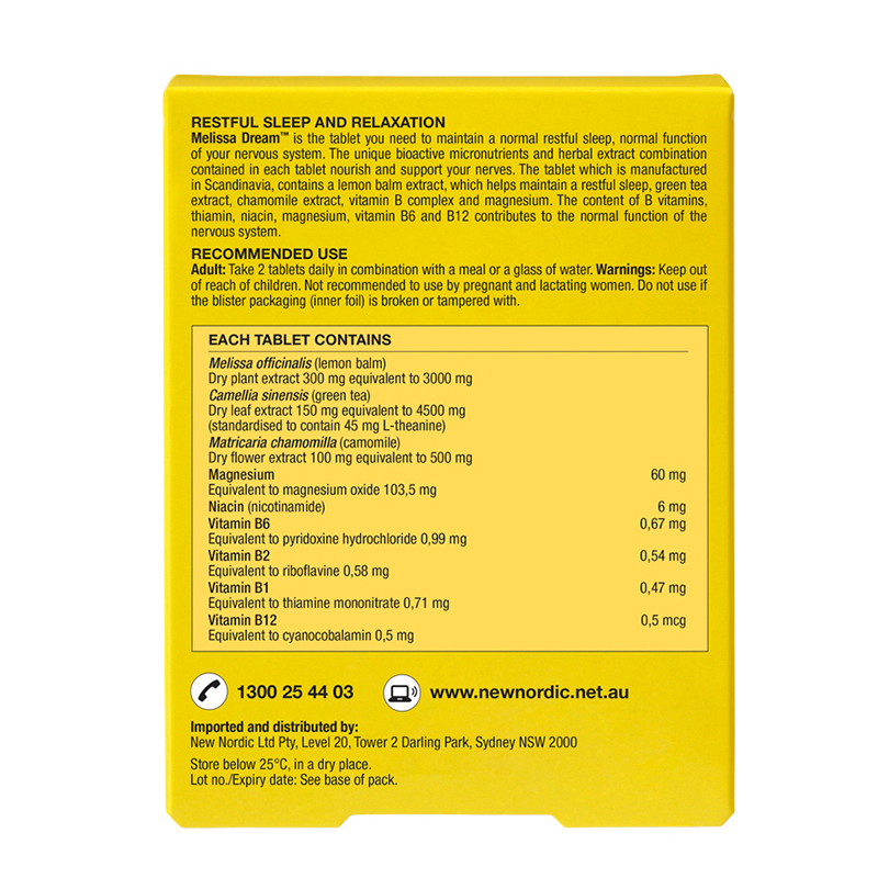 The Melissa Dream tablet is based on a combination extract made from lemon balm, chamomile and green tea plus vitamin-B and magnesium. Lemon balm contributes to a normal, calm and healthy sleep. Read more
