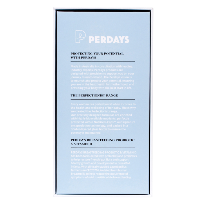 Perdays Breastfeeding Probiotic & Vitamin D is Formulated with 3bn CFU Lactobacillus fermentum CECT5716, this powerful probiotic can help reduce the occurrence of both mild mastitis in breastfeeding mothers and symptoms of upper respiratory tract infections in breastfed healthy infants. Delivered in our patent Nutriseal-Caps™ technology for optimal absorption.