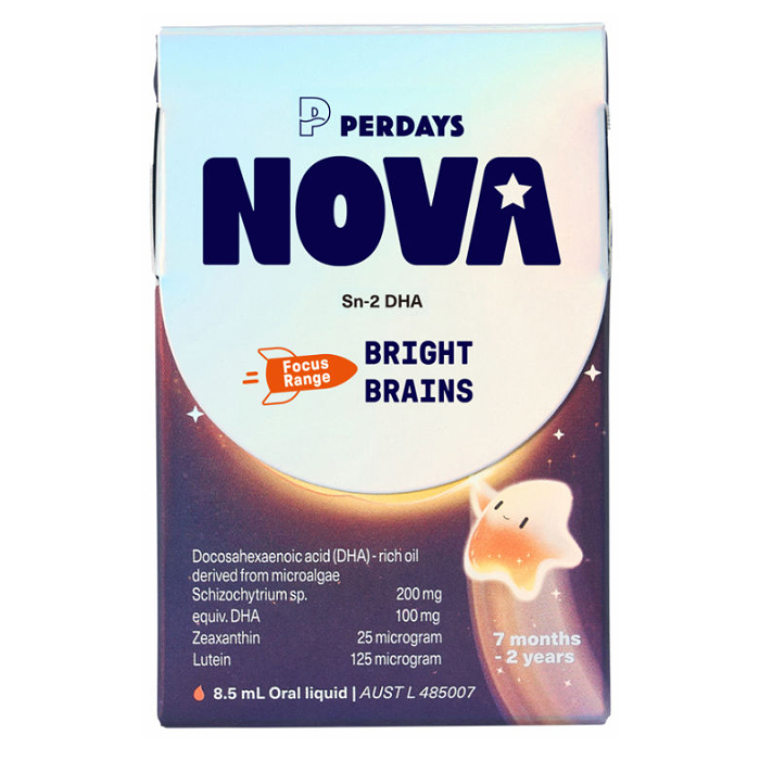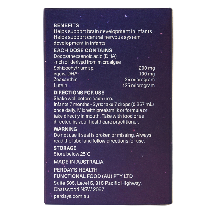 Perdays easy to use, pleasant tasting liquid formula, helps to support your infant's brain development with algae-based sn-2 DHA.