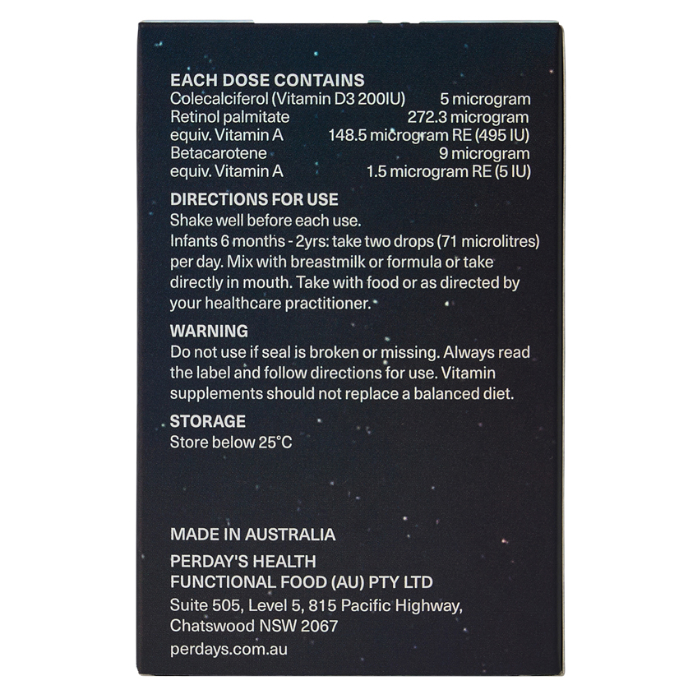 - Infants 6 months - 2yrs: take 2 drops (71 microlitres) per day.