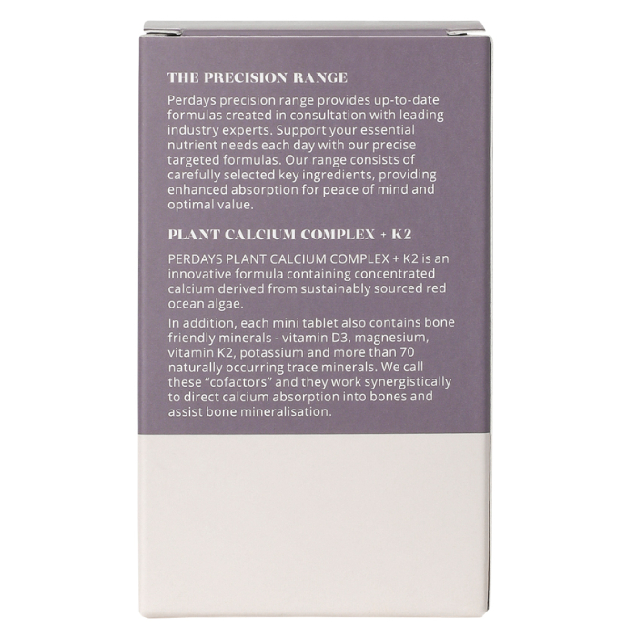 Perdays Plant Calcium Complex + K2 is an innovative formula with plant-based calcium from sustainably harvested red ocean algae, that’s rich in bone-nourishing calcium, magnesium and more than 72 trace minerals. It also contains bone friendly minerals vitamin D, magnesium, vitamin K2 and potassium, to further strengthen our formula (and your bones!).