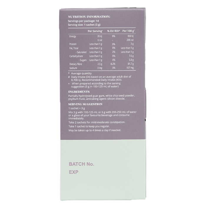 Thoughtfully formulated with clinically tested Sunfibre®, white chia seed powder and psyllium husk, this unflavoured, easy to drink blend of prebiotics and fibre promotes a healthy gut, regular bowel function and helps you feel fuller for longer.