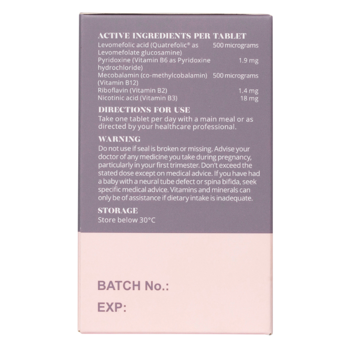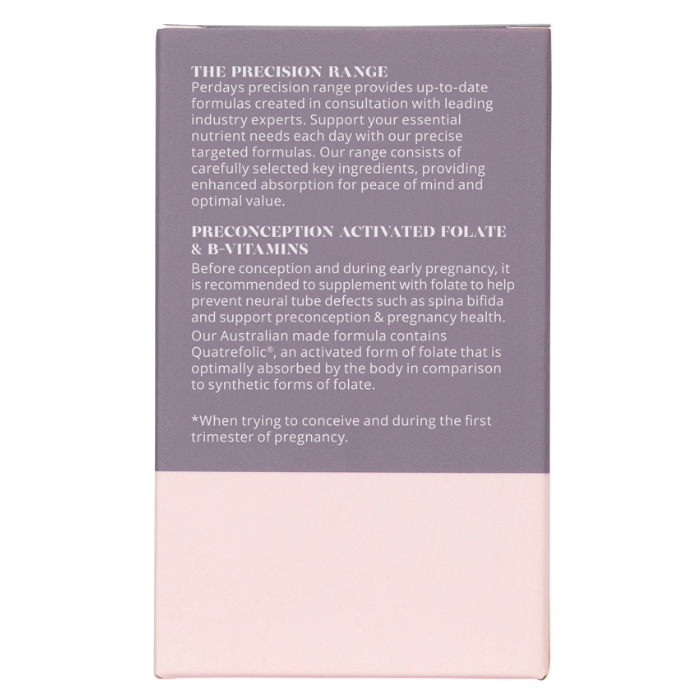 Perdays Activated Folate & B-Vitamins contains Quatrefolic®, a patented, biologically active form of folate that helps to bypass folic acid conversion limitations, supporting your preconception health and helping to support healthy foetal CNS/brain development in early pregnancy.