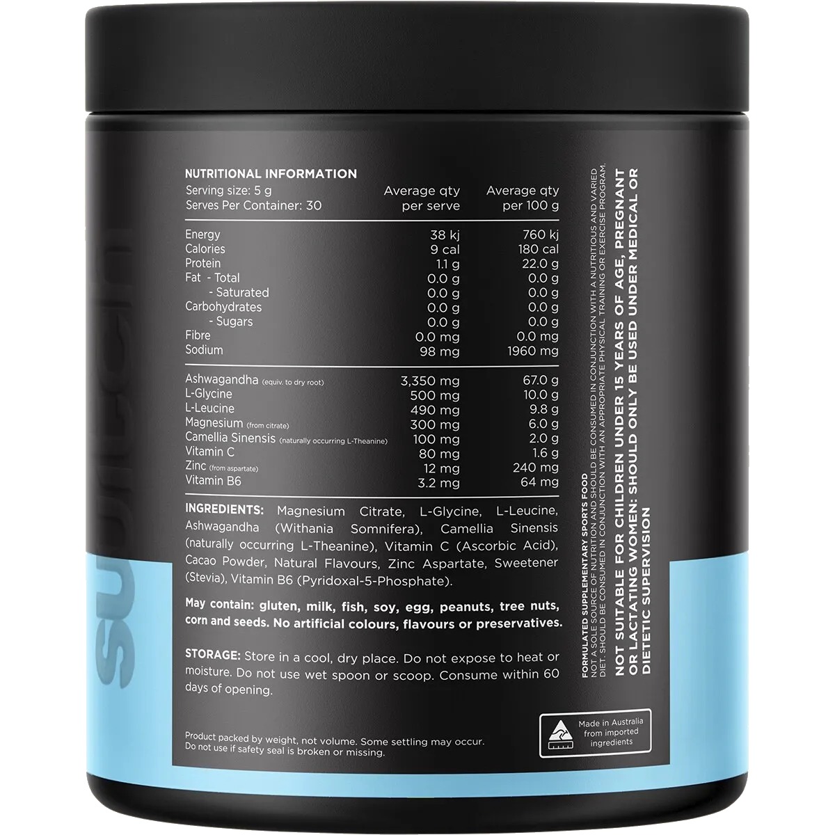 Magnesium Citrate, L-Glycine, L-Leucine, Ashwagandha (Withania Somnifera), Camellia Sinensis (naturally Occurring L-Theanine), Vitamin C (Ascorbic Acid), Cacao Powder, Natural Flavours, Zinc Aspartate, Sweetener (Stevia), Vitamin B6 (Pyridoxal-5-Phosphate).