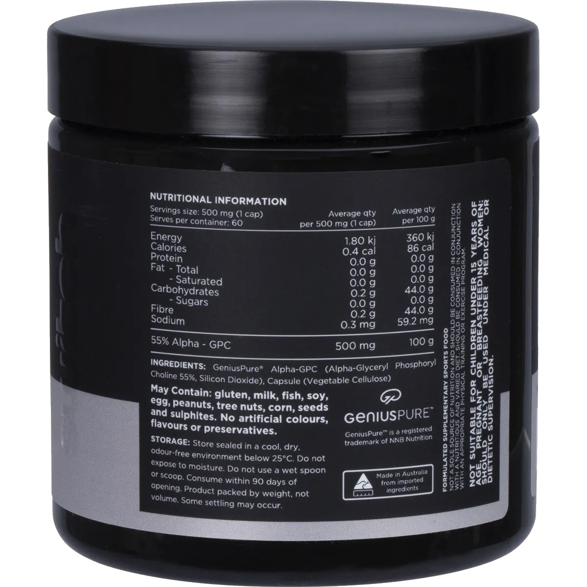 GeniusPure® Alpha-GPC (Alpha-Glyceryl Phosphoryl Choline 55%), Silicon Dioxide, Capsule (Vegetable Cellulose)