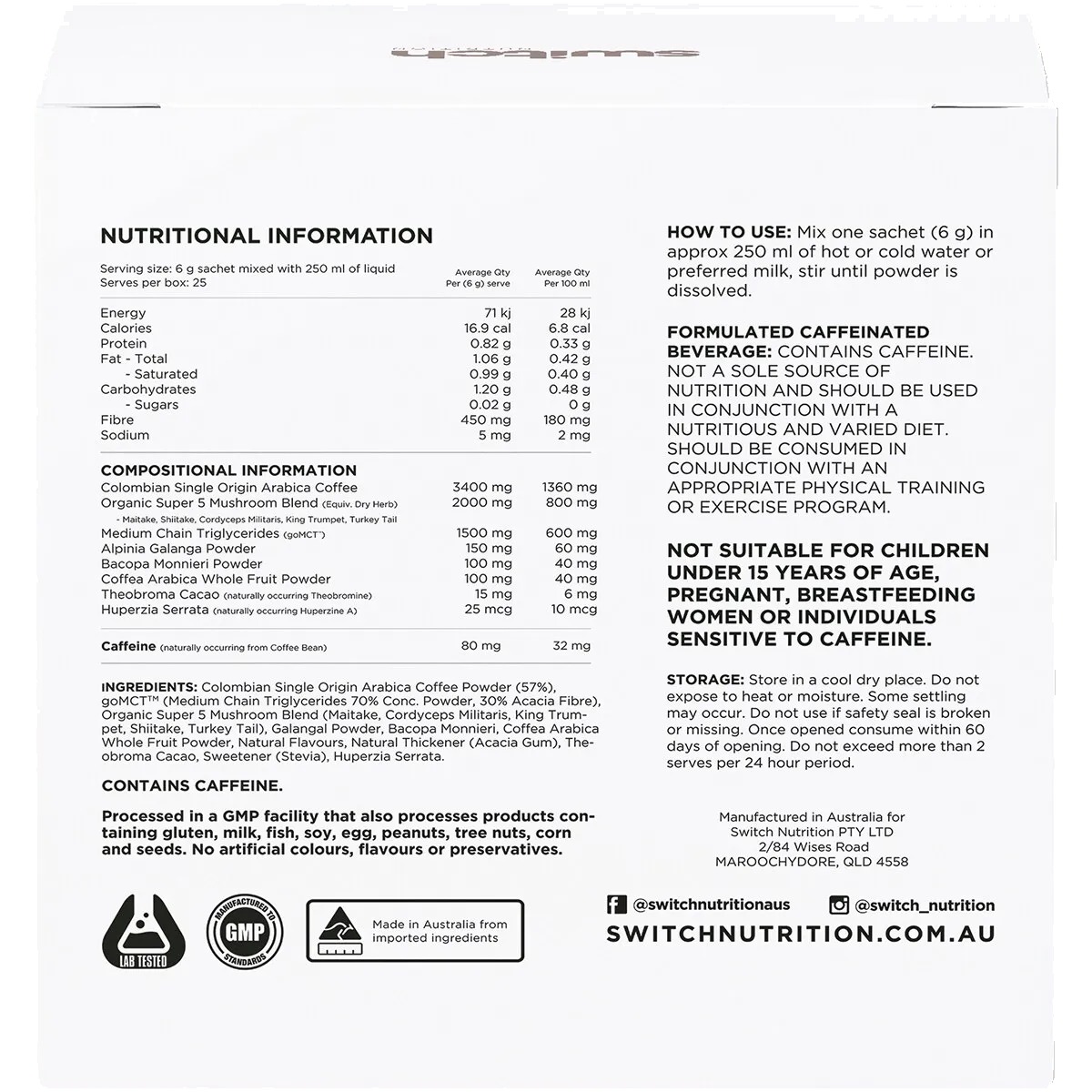 Colombian Single Origin Arabica Coffee Powder (57%), goMCT™ (Medium Chain Triglycerides 70% Conc. Powder, 30% Acacia Fibre), Organic Super 5 Mushroom Blend (Maitake, Cordyceps Militaris, King Trumpet, Shiitake, Turkey Tail), Galangal Powder, Bacopa Monnieri, Coffea Arabica Whole Fruit Powder, Natural Flavours, Natural Thickener (Acacia Gum), Theobroma Cacao, Sweetener (Stevia), Huperzia Serrata.