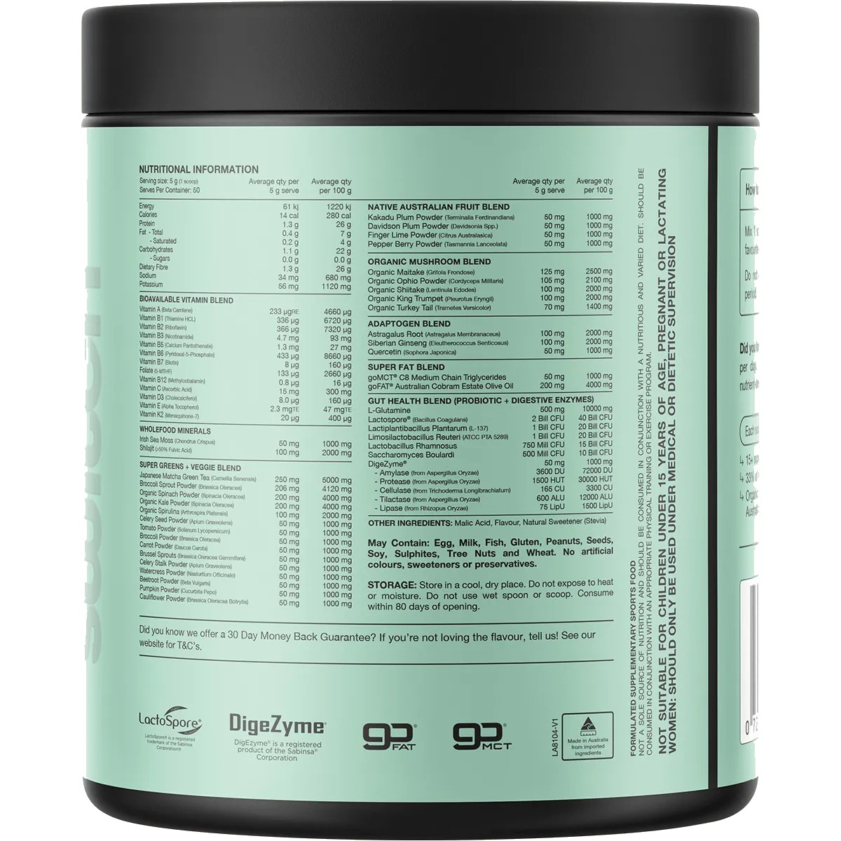 Super Greens & Vege Blend Japanese Matcha Green Tea, Broccoli Sprout Extract, Organic Spinach Powder, Organic Kale Powder, Organic Spirulina, Celery Seed Powder, Tomato Powder, Broccoli Powder, Carrot Powder, Brussels Sprouts Powder, Celery Stalk Powder, Watercress Powder, Beetroot Powder, Pumpkin Powder, Cauliflower Powder, Organic Mushroom Blend (Organic Maitake Mushroom, Organic Cordyceps Militaris, Organic Shiitake Mushroom, Organic King Trumpet Mushroom, Organic Turkey Tail Mushroom), Gut Health Blend L-Glutamine, Digezyme® (Amylase, Protease, Cellulase, Tilactase, Lipase), Lactospore® (Bacillus Coagulans), Lactiplantibacillus Plantarum, Limosilactobacillus Reuteri, Lactobacillus Rhamnosus, Saccharomyces Boulardii), Flavour, Malic Acid, Adaptogen Blend (Astragalus Root, Siberian Ginseng, Quercetin) Super Fat Blend (Gofat® Australian Cobram Estate Olive Oil GoMTC® C8 Medium Chain Triglycerides), Native Australian Fruit Blend (Kakadu Plum Powder, Davidson Plum Powder, Finger Lime Powder, Pepper Berry Powder), Bioavailable Vitamin Blend (Vitamin C (Ascorbic Acid), Vitamin E (Dl-Alpha Tocopherol), Vitamin B3 (Niacinamide), Vitamin B5 (Pantothenic Acid), Vitamin B6 (Pyridoxal 5-Phosphate), Vitamin B2 (Riboflavin), Vitamin B1 (Thiamin), Vitamin A (Beta Carotene), Vitamin K2 (Menaquinone-7), Vitamin D3 (Cholecalciferol), Vitamin B7 (Biotin), Folate (5-Mthf), Vitamin B12 (Methyl cobalamin)), Wholefood Mineral Blend (Organic Himalayan Shilajit (=50% Fulvic Acid, Irish Sea Moss), Natural Sweetener (Stevia).