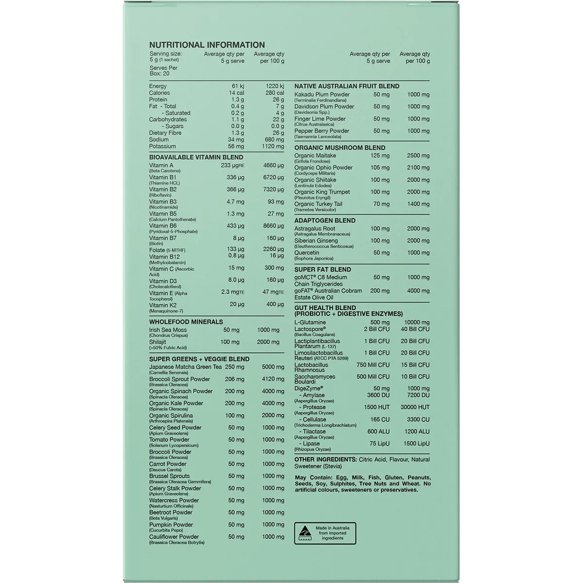 Super Greens & Vege Blend Japanese Matcha Green Tea, Broccoli Sprout Extract, Organic Spinach Powder, Organic Kale Powder, Organic Spirulina, Celery Seed Powder, Tomato Powder, Broccoli Powder, Carrot Powder, Brussels Sprouts Powder, Celery Stalk Powder, Watercress Powder, Beetroot Powder, Pumpkin Powder, Cauliflower Powder, Organic Mushroom Blend (Organic Maitake Mushroom, Organic Cordyceps Militaris, Organic Shiitake Mushroom, Organic King Trumpet Mushroom, Organic Turkey Tail Mushroom), Gut Health Blend L-Glutamine, Digezyme® (Amylase, Protease, Cellulase, Tilactase, Lipase), Lactospore® (Bacillus Coagulans), Lactiplantibacillus Plantarum, Limosilactobacillus Reuteri, Lactobacillus Rhamnosus, Saccharomyces Boulardii), Flavour, Citric Acid, Adaptogen Blend (Astragalus Root, Siberian Ginseng, Quercetin) Super Fat Blend (Gofat® Australian Cobram Estate Olive Oil GoMTC® C8 Medium Chain Triglycerides), Native Australian Fruit Blend (Kakadu Plum Powder, Davidson Plum Powder, Finger Lime Powder, Pepper Berry Powder), Bioavailable Vitamin Blend (Vitamin C (Ascorbic Acid), Vitamin E (Dl-Alpha Tocopherol), Vitamin B3 (Niacinamide), Vitamin B5 (Pantothenic Acid), Vitamin B6 (Pyridoxal 5-Phosphate), Vitamin B2 (Riboflavin), Vitamin B1 (Thiamin), Vitamin A (Beta Carotene), Vitamin K2 (Menaquinone-7), Vitamin D3 (Cholecalciferol), Vitamin B7 (Biotin), Folate (5-Mthf), Vitamin B12 (Methyl cobalamin)), Wholefood Mineral Blend (Organic Himalayan Shilajit (=50% Fulvic Acid, Irish Sea Moss), Natural Sweetener (Stevia).