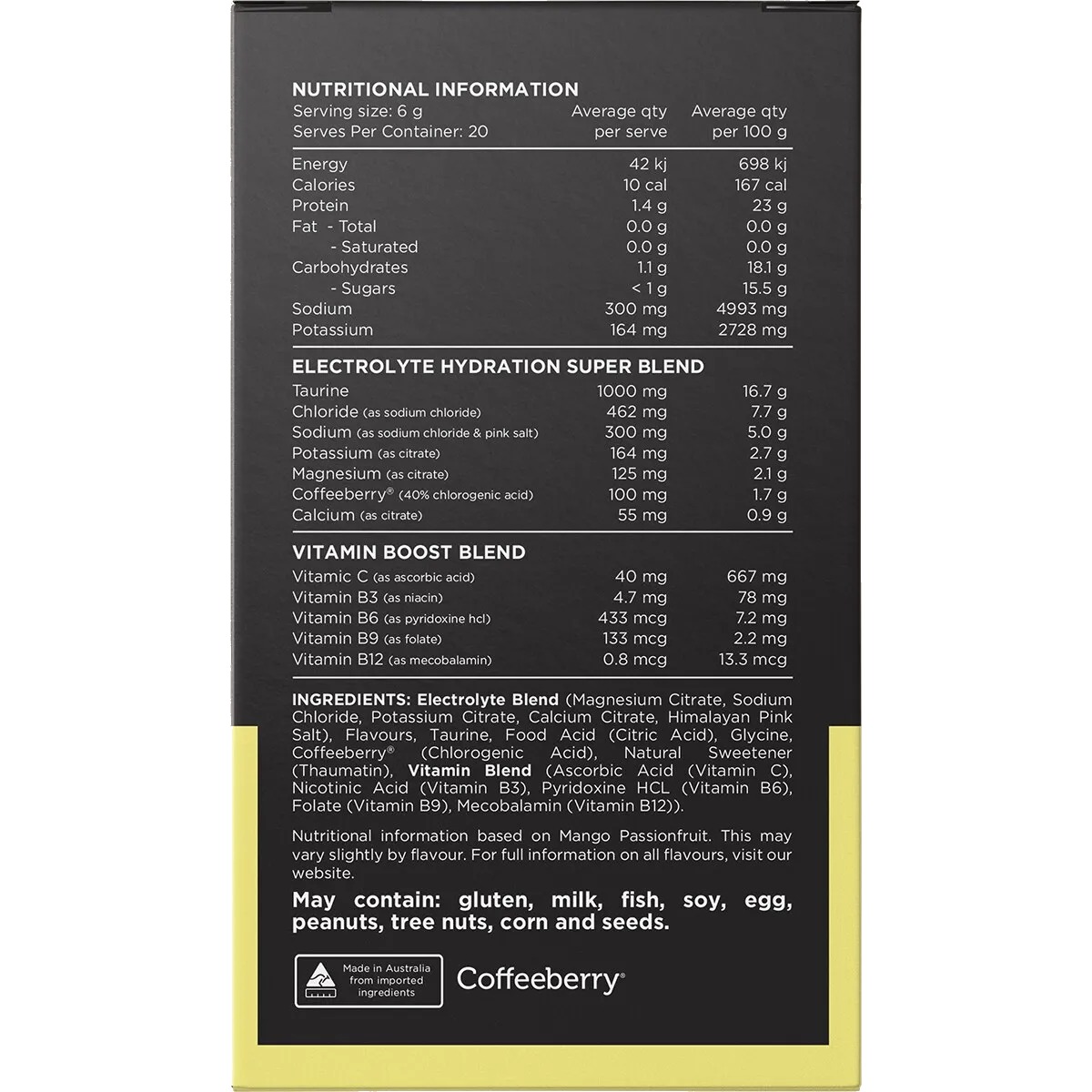 Electrolyte Blend (Magnesium Citrate, Sodium Chloride, Potassium Citrate, Calcium Citrate, Himalayan Pink Salt), Flavours, Taurine, Food Acid (Citric Acid), Glycine, Coffeeberry (Chlorogenic Acid), Natural Sweetener (Thaumatin), Vitamin Blend (Ascorbic Acid (Vitamin C), Niacin Acid (Vitamin B3), Pyridoxine HCL (Vitamin B6), Folate (Vitamin B9), Mecobalamin (Vitamin B12)