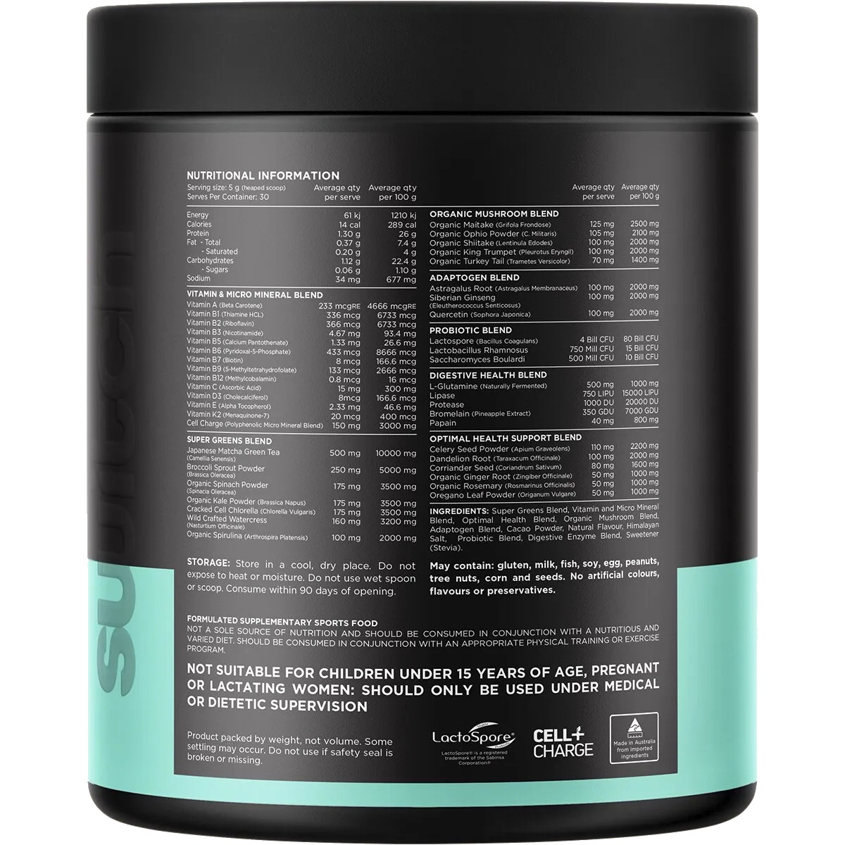 Super Greens Blend (Japanese Matcha Green Tea (Camellia Sinensis), Broccoli Sprout Powder (Brassica Oleracea), Organic Spinach Powder (Spinacia Oleracea), Organic Kale Powder (Brassica Napus), Cracked Cell Chlorella (Chlorella Vulgaris), Wild Crafted Watercress (Nasturtium Officinale), Organic Spirulina (Arthrospira Platensis), Vitamin and Micro Mineral Blend (Vitamin A (Beta Carotene) Vitamin B1 (Thiamine HCL), Vitamin B2 (Riboflavin), Vitamin B3 (Nicotinamide), Vitamin B5 (Calcium Pantothenate), Vitamin B6 (Pyridoxal-5-Phosphate), Vitamin B7 (Biotin), Vitamin B9 (S-Methyltetrahydrafolate), Vitamin B12 (Methylcobalamin), Vitamin C (Ascorbic Acid), Vitamin D3 (Cholecalciferol), Vitamin E (Alpha Tocopherol), Vitamin K2 (Menaquinone-7), Cell Charge (Polyphenolic Micro Mineral Blend)), Optimal Health Blend (Celery Seed Powder (Apium Graveolens), Dandelion Root (Taraxacum Officinale), Coriander Seed (Coriandrum Sativum), Organic Ginger Root (Zingiber Officinale) Organic Rosemary (Rosmarinus Officinalis), Oregano Leaf Powder (Origanum Vulgare)), Organic Mushroom Blend (Organic Maitake (Grifols Frondose) Organic Ophio Powder (c. Militaris), Organic Shiitake (Lentinula Edodes), Organic King Trumpet (Pleurotus Eryngil), Organic Turkey Tail (Trametes Versicolor)), Adaptogen Blend (Astragalus Root (Astragalus Membranaceus), Siberian Ginseng (Eleutherococcus Senticosus), Quercetin (Sophora Japonica)), Thickener (Naturally Fermented L-Glutamine 500mg), Cacao Powder, Natural Flavour, Himalayan Sea Salt, Probiotic Blend (Lactospore (Bacillus Coagulans), Lactobacillus Rhamnosus, Saccharomyces Boulardi), Digestive Enzyme Blend (Lipase, Protease, Bromelain (Pineapple Extract), Papain), Sweetener (Stevia).