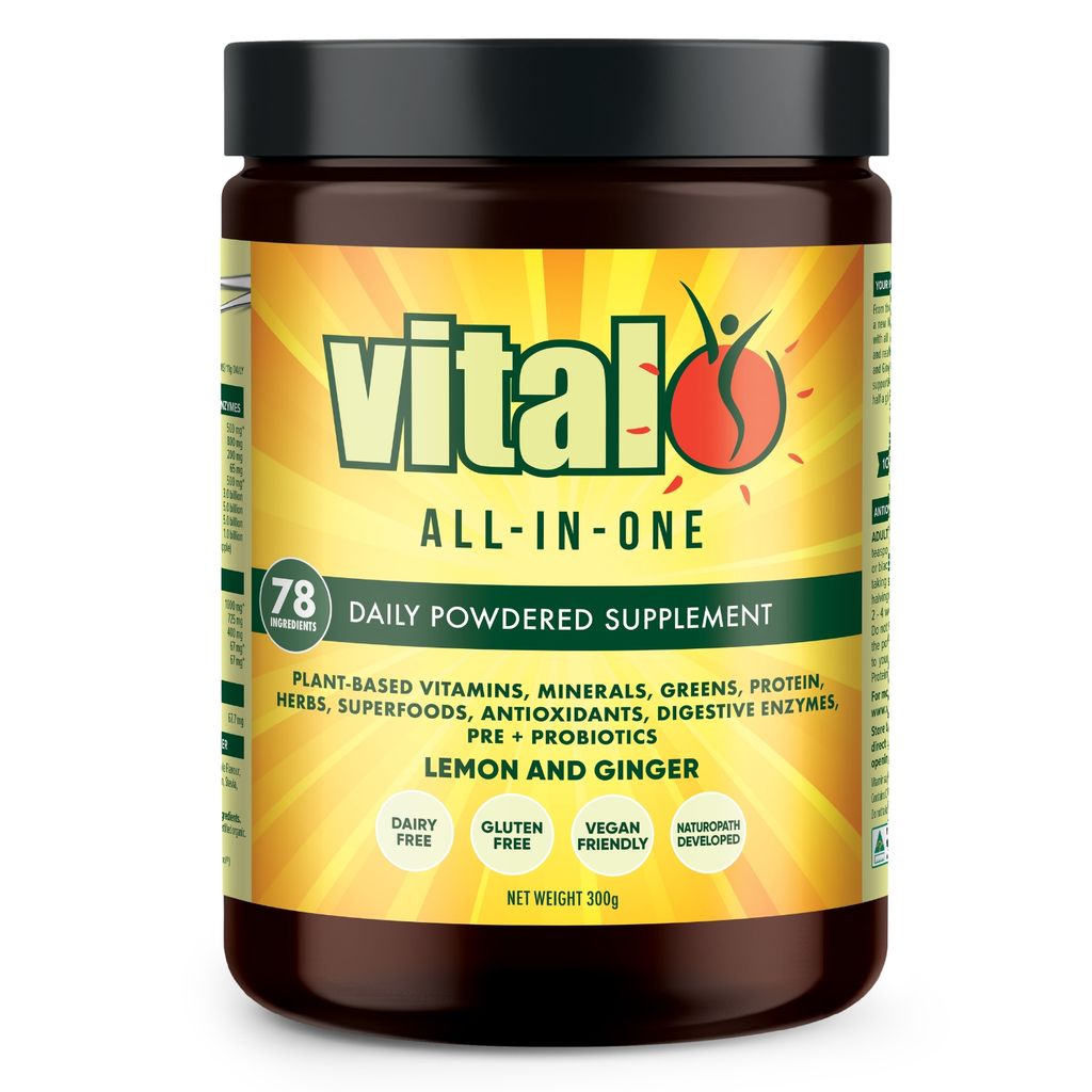 Just two teaspoons daily of Vital All-In-One delivers 78 vital ingredients that are loaded with probiotics, prebiotics, vitamins, minerals, antioxidants, essential fatty acids, fibre and a unique high alkalising pea protein.